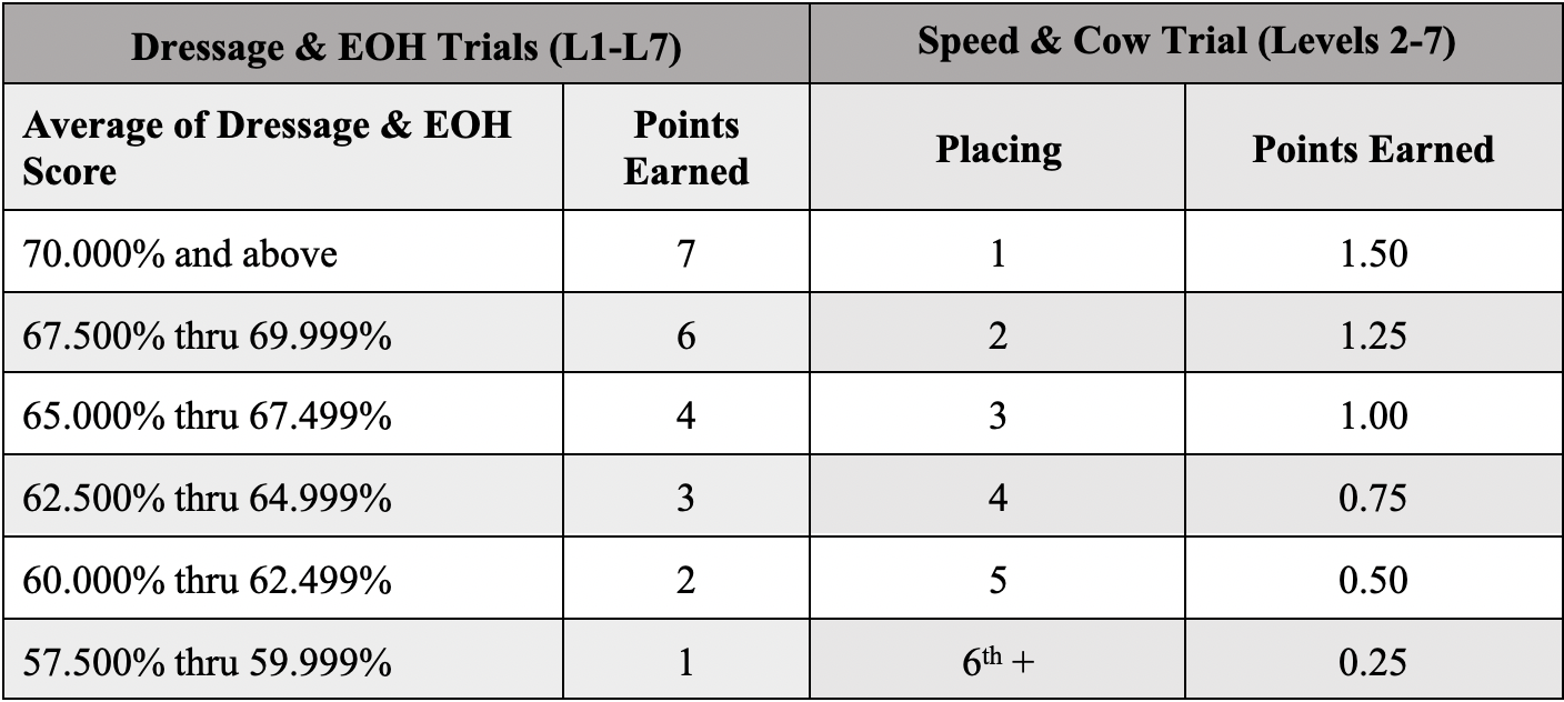 Horse/Rider pairs can accrue a maximum of 10 points per licensed competition if competing in four trials – (L2-L7) Dressage, EOH, Speed & Cattle; 8.5 points if competing in three trials – (L2-L7) Dressage, EOH and Speed; or 7 points if competing in two trials – (L1) Dressage and EOH.